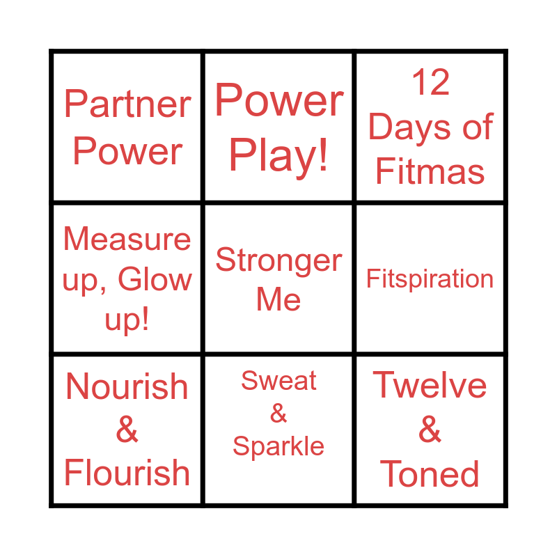 This bingo card has 9 words: Nourish & Flourish, 12 Days of Fitmas, Power Play!, Measure up, Glow up!, Partner Power, Fitspiration, Stronger Me, Twelve & Toned and Sweat & Sparkle.