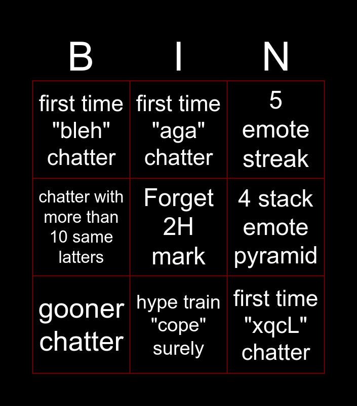 This bingo card has a free space and 8 words: 4 stack emote pyramid, 5 emote streak, first time "aga" chatter, gooner chatter, first time "bleh" chatter, first time "xqcL" chatter, chatter with more than 10 same latters and hype train "cope" surely.