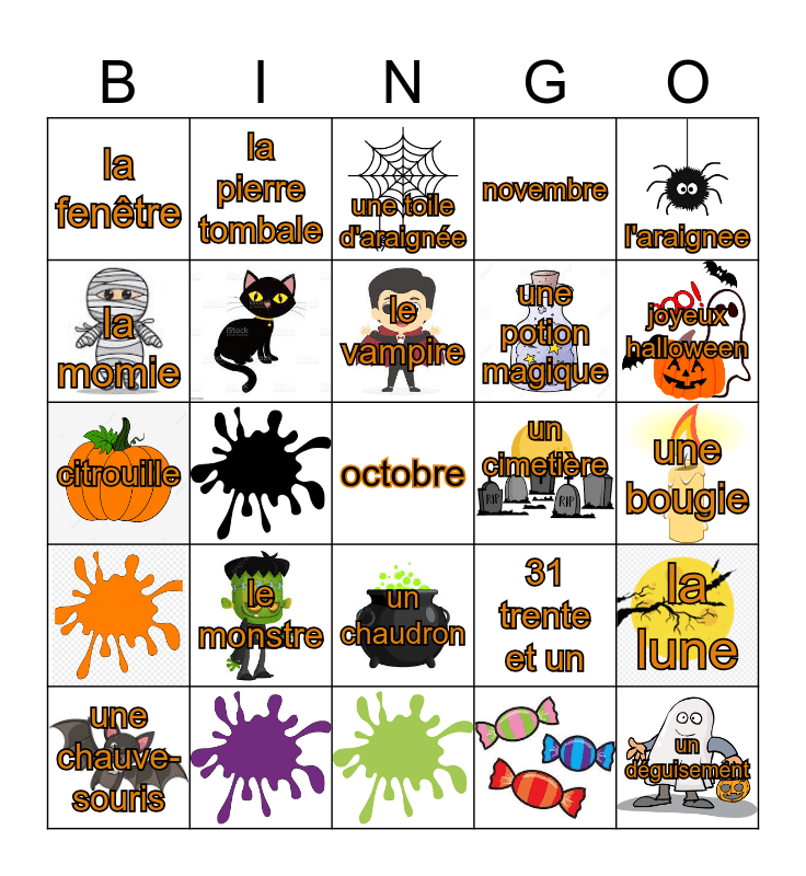 This bingo card has 27 images and 26 words: le fantome, le sorciere, le vampire, l'araignee, la momie, le monstre, octobre, novembre, la lune, citrouille, 31 trente et un, un déguisement, une chauve-souris, une momie, un chaudron, une potion magique, joyeux halloween, la magie, une baguette magique, un diable, un cimetière, une bougie, une toile d'araignée, la fenêtre, la pierre tombale and le squelette.
