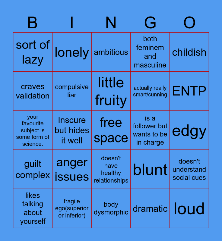 This bingo card has a free space and 24 words: anger issues, fragile ego(superior or inferior), little fruity, likes talking about yourself, childish, sort of lazy, craves validation, lonely, is a follower but wants to be in charge, doesn't have healthy relationships, actually really smart/cunning, your favourite subject is some form of science., blunt, doesn't understand social cues, compulsive liar, dramatic, edgy, ambitious, ENTP, Inscure but hides it well, loud, guilt complex, both feminem and masculine and body dysmorphic.