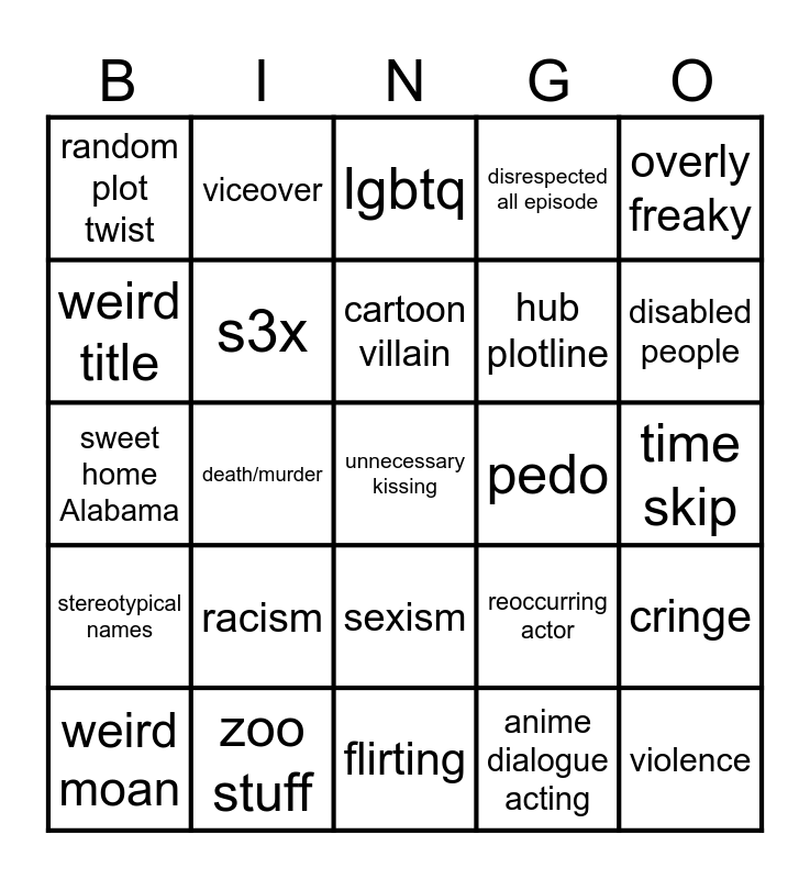 This bingo card has a free space and 24 words: racism, zoo stuff, cartoon villain, weird moan, overly freaky, random plot twist, weird title, viceover, pedo, sexism, hub plotline, sweet home Alabama, reoccurring actor, cringe, s3x, anime dialogue acting, time skip, lgbtq, disabled people, death/murder, violence, stereotypical names, disrespected all episode and flirting.