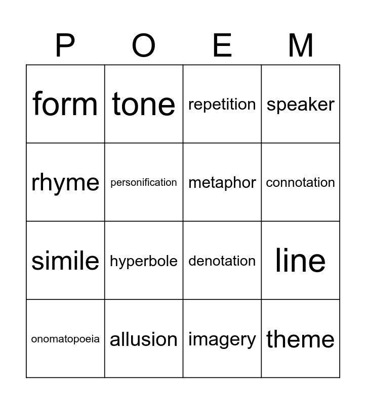 This bingo card has 18 words: hyperbole, theme, repetition, form, denotation, speaker, onomatopoeia, tone, connotation, simile, imagery, rhyme, line, personification, metaphor, stanza, allusion and alliteration.