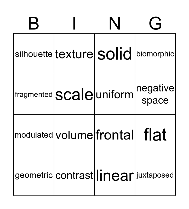 This bingo card has 38 words: saturated, abstract(ed), naturalistic, uniform, symmetrical, foreground, negative space, somber, fragmented, modulated, flat, biomorphic, geometric, linear, scale, juxtaposed, clear, solid, shallow, contrast, silhouette, weight, volume, perspective, spatial recession, monumental, composition, figurative, horizontal, picture plane, modeled, pattern, painterly, texture, profile, orientation, frontal and repoussoir.