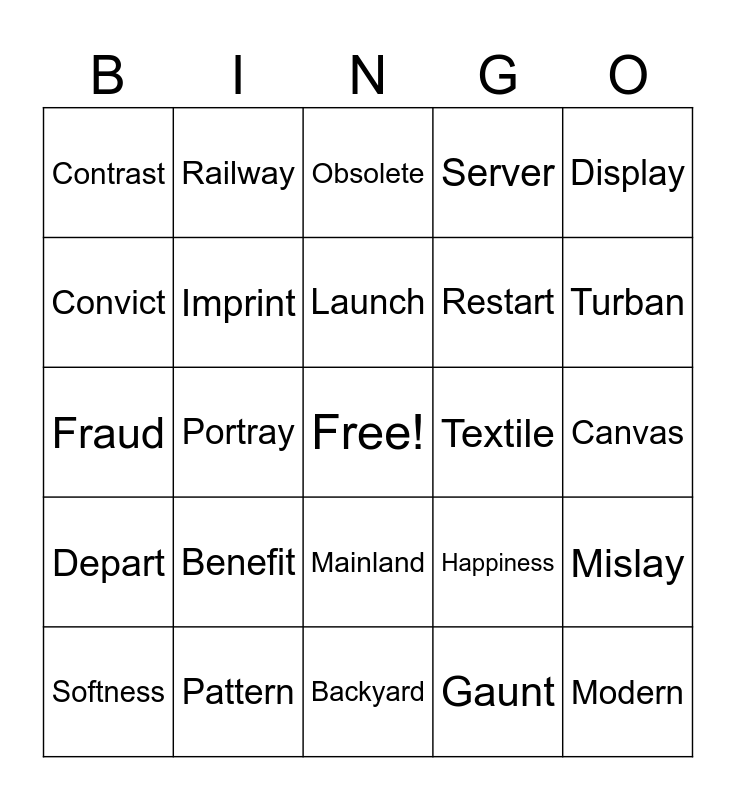 This bingo card has a free space and 231 words: Pathway, Waist, Mainland, Maintain, Midday, Rapid, Flashback, Haystack, Milkman, Railway, Cabin, Claim, Pigtail, Midway, Madman, Misfit, Dash, Abstract, Mainsail, Misplay, Addict, Mishap, Disband, Disclaim, Mislay, Mint, Distract, Admit, Display, Miscast, Aim, Abstain, Dismay, Distant, Misprint, Backspin, Audit, Candid, Fault, Cause, Captain, Waistband, Timid, Mainstay, Vault, Fraud, Strain, Victim, Valid, Gaunt, Grandstand, Insist, Commit, Imprint, Camp, Inlaid, Consist, Contrast, Inhabit, Dim, Convict, Instant, Implant, Complain, Impact, Cash, Distinct, Command, Mislaid, Canvas, Impair, Infant, Curtail, Birthday, Turn, Auto, Astronaut, Random, Launch, Verdict, Vitamin, Blackbird, Turban, Whirlwind, Pattern, Server, Taunt, Prefer, Restrict, Complaint, Prohibit, Betray, Detail, Insert, Cotton, Reclaim, Decay, Disturb, Prepay, Restrain, Beyond, District, Proclaim, Absurd, Prison, Preplan, Defraud, Confirm, Blizzard, Haunt, Holiday, Mermaid, Modern, Transport, Northern, Cargo, Hardship, Garland, Cavern, Overhaul, Backyard, Border, Partnership, Unfit, Preprogram, Obtain, Alarm, Perform, Repay, Uncommon, Depart, Prolong, Absorb, Discard, Unafraid, Permit, Impart, Persist, Portray, Alert, Misinform, Discomfort, Prefix, Apart, Riverside, Costume, Landscape, Stampede, Maximum, Microscope, Launder, Murmur, Borderline, Tornado, Husband, Autumn, Backbone, Handshake, Obsolete, Misbehave, Provide, Minimum, Record, Entertain, Exact, Combine, Restart, Reconstruct, Unaware, Exclude, Invalid, Impolite, Promote, Encase, Prescribe, Readjust, Unsafe, Conclude, Umpire, Extreme, Turmoil, Corduroy, Homeland, Corrode, Void, Forlorn, Barter, Poison, Boycott, Asteroid, Oyster, Stubborn, Pauper, Govern, Hoist, Hopelessness, Explaining, Incomplete, Employed, Economic, Relaxing, Happiness, Admire, Carelessness, Classic, Dominates, Mistakes, Disrupt, Plastic, Rejoined, Predict, Destroyed, Fantastic, Softness, Propose, Completeness, Splendid, Airspeed, Female, Forget, Textile, Membership, Freedom, Forest, Canteen, Benefit, Leftover, Homemade, Fifteenth, Landlord and Evergreen.