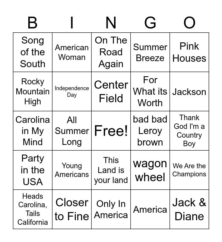 This bingo card has a free space and 31 words: Only In America, R.O.C.K in the USA, All Summer Long, Drink In My Hand, Song of the South, On The Road Again, Independence Day, wagon wheel, bad bad Leroy brown, America, Thank God I'm a Country Boy, Jack & Diane, Living in America, Kids in America, Jackson, American Saturday Night, We Are the Champions, Young Americans, Party in the USA, This Land is your land, Pink Houses, California Dreaming, Heads Carolina, Tails California, American Woman, For What its Worth, Rocky Mountain High, Summer Breeze, Carolina in My Mind, Closer to Fine, Center Field and Old Time Rock and Roll.