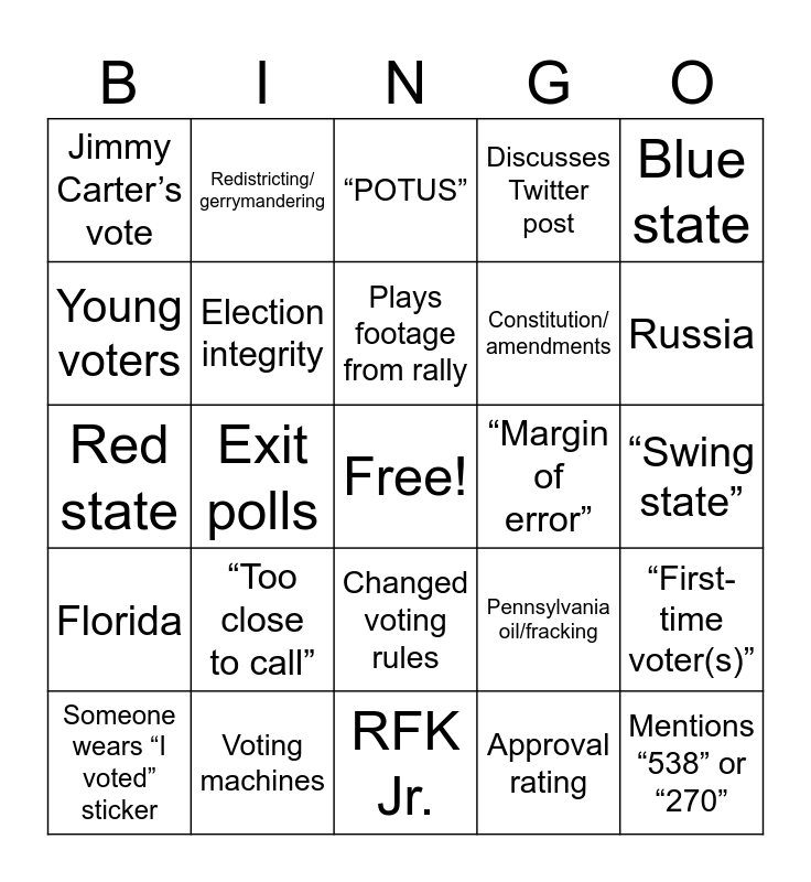 This bingo card has a free space and 30 words: Voting machines, Interview with undecided/ unaffiliated voter, Exit polls, Breaking news, Jimmy Carter’s vote, “POTUS”, Election integrity, Changed voting rules, “Margin of error”, RFK Jr., “Swing state”, Mentions “538” or “270”, Approval rating, “Record turnout”, Russia, Foreign interference, Pennsylvania oil/fracking, Florida, “Too close to call”, Blue state, Red state, Discussion of election before 2016, Redistricting/ gerrymandering, Constitution/ amendments, Young voters, Discusses Twitter post, “First-time voter(s)”, Someone wears “I voted” sticker, Plays footage from rally and Mail-in votes.