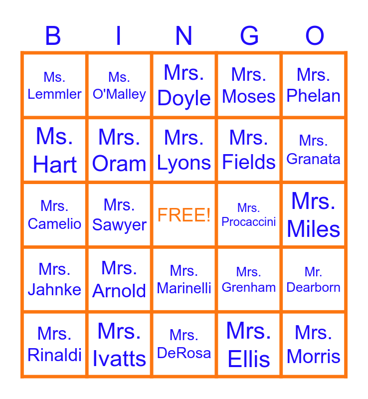 This bingo card has a free space and 29 words: Mrs. Rinaldi, Mrs. Davis, Mrs. Sawyer, Mrs. Audet, Ms. Lemmler, Mrs. Doyle, Mrs. Oram, Mrs. Arnold, Mrs. Procaccini, Mrs. Ivatts, Mrs. Miles, Mrs. Morris, Mrs. DeRosa, Mrs. Ellis, Mrs. Granata, Mrs. Aquilino, Mrs. Marinelli, Mrs. Jahnke, Mrs. Phelan, Mrs. Camelio, Mrs. Grenham, Mrs. Doucette, Mrs. Fields, Ms. Hart, Mrs. Moses, Ms. O'Malley, Mr. Dearborn, Mrs. Lyons and Mrs. Massicotte.