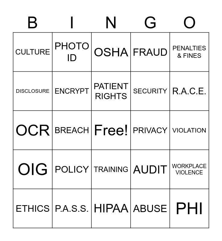This bingo card has a free space and 29 words: ETHICS, REPORT, BREACH, SAFETY, CULTURE, OSHA, ENCRYPT, POLICY, PRIVACY, P.A.S.S., VIOLATION, PHI, HIPAA, ABUSE, R.A.C.E., e-PHI, TRAINING, OIG, PENALTIES & FINES, OCR, AUDIT, ZERO-TOLERANCE, SECURITY, DISCLOSURE, FRAUD, PHOTO ID, WORKPLACE VIOLENCE, PATIENT RIGHTS and EVACUATE.