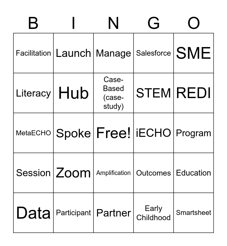 This bingo card has a free space and 40 words: ECHO, MetaECHO, Superhub, Hub, Participant, Amplification, Case-Based (case-study), Community of Practice, SME, Session, Spoke, Salesforce, Smartsheet, Program, iECHO, Zoom, Coordination, Facilitation, Outreach, Manage, Education, Early Childhood, STEM, Literacy, General K-12, Strategic, Operations, Processes, SOPs, Research, Evaluation, Data, Survey, Outcomes, REDI, Partner, Prospect, PLT, Launch and Funnel.