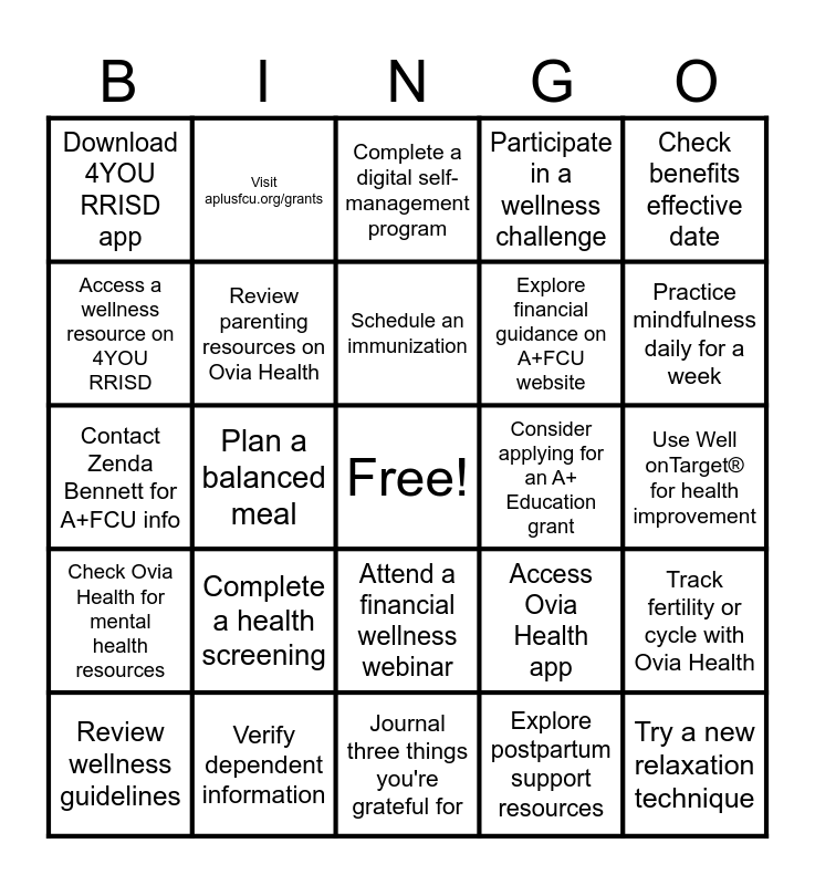 This bingo card has a free space and 24 words: Complete a health screening, Verify dependent information, Schedule an immunization, Review wellness guidelines, Check benefits effective date, Download 4YOU RRISD app, Access a wellness resource on 4YOU RRISD, Visit aplusfcu.org/grants, Consider applying for an A+ Education grant, Attend a financial wellness webinar, Explore financial guidance on A+FCU website, Contact Zenda Bennett for A+FCU info, Access Ovia Health app, Track fertility or cycle with Ovia Health, Review parenting resources on Ovia Health, Explore postpartum support resources, Use Well onTarget® for health improvement, Complete a digital self-management program, Practice mindfulness daily for a week, Plan a balanced meal, Try a new relaxation technique, Check Ovia Health for mental health resources, Participate in a wellness challenge and Journal three things you're grateful for.