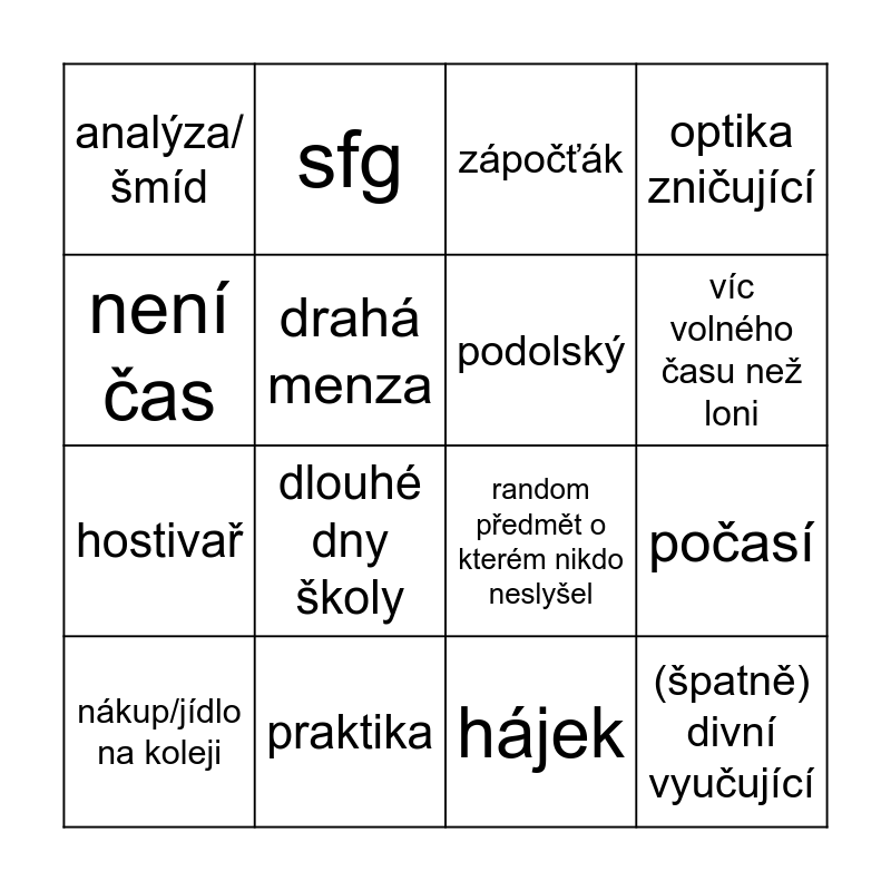 This bingo card has 16 words: praktika, počasí, zápočťák, analýza/šmíd, hostivař, sfg, random předmět o kterém nikdo neslyšel, hájek, není čas, drahá menza, nákup/jídlo na koleji, optika zničující, dlouhé dny školy, víc volného času než loni, podolský and (špatně) divní vyučující.