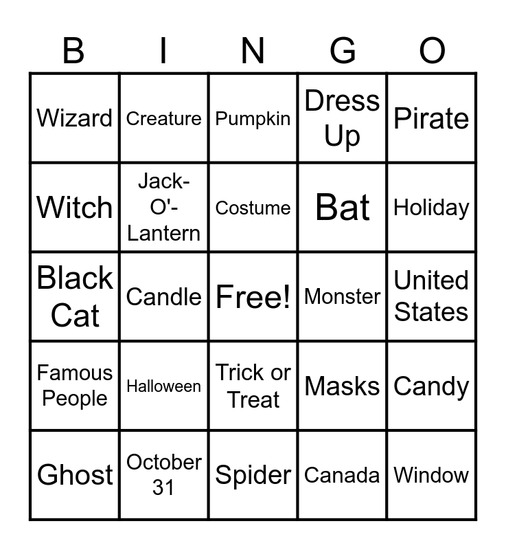This bingo card has a free space and 24 words: Halloween, October 31, Costume, Ghost, Pirate, Wizard, Witch, Creature, Monster, Trick or Treat, Bat, Black Cat, Masks, Candy, Jack-O'-Lantern, Canada, United States, Pumpkin, Holiday, Candle, Window, Famous People, Dress Up and Spider.