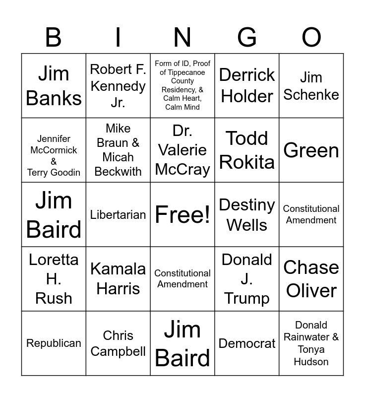 This bingo card has a free space and 24 words: Kamala Harris, Chris Campbell, Dr. Valerie McCray, Republican, Jim Schenke, Jim Banks, Jennifer McCormick & Terry Goodin, Robert F. Kennedy Jr., Destiny Wells, Constitutional Amendment, Todd Rokita, Jim Baird, Donald J. Trump, Chase Oliver, Mike Braun & Micah Beckwith, Democrat, Constitutional Amendment, Form of ID, Proof of Tippecanoe County Residency, & Calm Heart, Calm Mind, Green, Libertarian, Donald Rainwater & Tonya Hudson, Loretta H. Rush, Derrick Holder and Jim Baird.