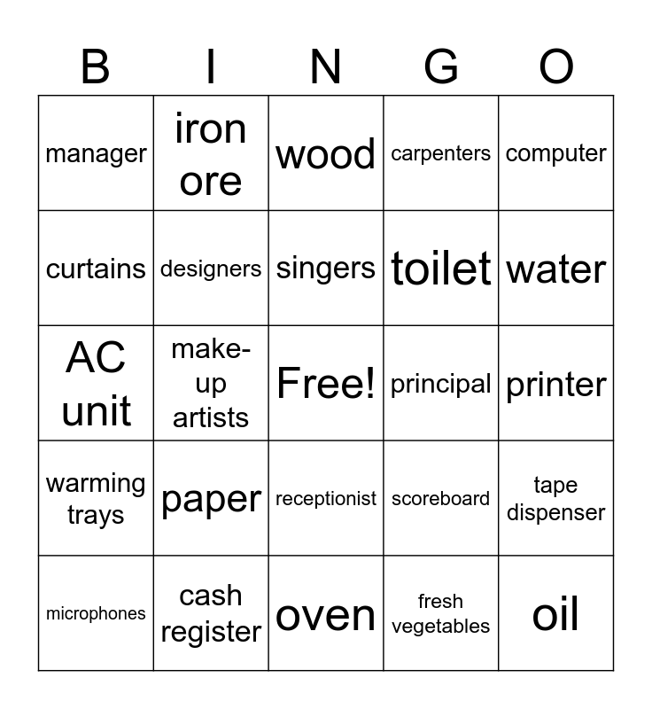 This bingo card has a free space and 74 words: ticket sellers, chairs, wood, cleaning crew, marble, musicians, steel beams, projector, microphones, set lights, silkworms, cotton, singers, curtains, make-up, make-up artists, costumes, water, drums, AC unit, designers, iron ore, carpenters, theater owner, oil, sound system, labor, land, capital, entrepreneur, computer, piano, programmer, business owner, cook, fresh vegetables, flour, cheese, fish, eggs, oven, cash register, barista, espresso machine, waiter, manager, concession seller, paper, copper wiring, teacher, pencil, pen, printer, coffee machine, telephone, marker, receptionist, printer ink, desk, tape dispenser, toilet, sink, warming trays, cafeteria staff, principal, football, football coach, uniforms, scoreboard, textbooks, librarian, novels, motivational poster and heating unit.