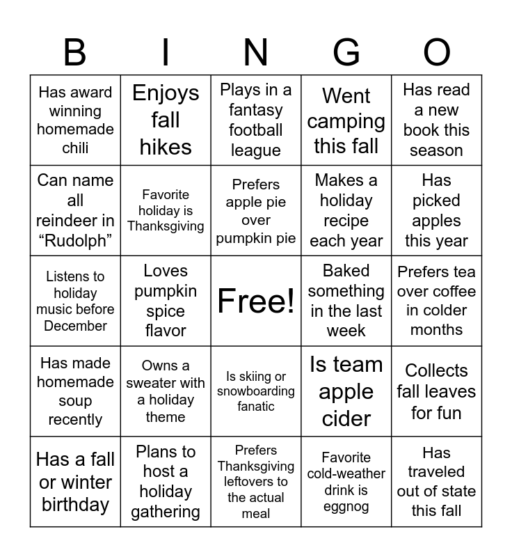 This bingo card has a free space and 36 words: Has visited a pumpkin patch this year, Drinks hot chocolate regularly, Has carved a pumpkin this year (pictures for proof!), Favorite holiday is Thanksgiving, Is team apple cider, Has made homemade soup recently, Prefers apple pie over pumpkin pie, Binge-watches holiday movies, Has read a new book this season, Knows how to knit or crochet, Loves pumpkin spice flavor, Went camping this fall, Has already started holiday shopping, Baked something in the last week, Has picked apples this year, Has award winning homemade chili, Is a fan of a non-WA football team, Owns a sweater with a holiday theme, Has traveled out of state this fall, Plays in a fantasy football league, Prefers tea over coffee in colder months, Collects fall leaves for fun, Plans to host a holiday gathering, Has a fall or winter birthday, Prefers Thanksgiving leftovers to the actual meal, Enjoys fall hikes, Listens to holiday music before December, Loves to cook for the holidays, Makes a holiday recipe each year, Can name all reindeer in “Rudolph”, Does NOT own a plaid shirt, Enjoys decorating for the holidays, Favorite cold-weather drink is eggnog, Is skiing or snowboarding fanatic, Enjoys wrapping presents and Has a holiday-themed coffee mug.