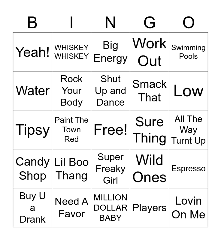 This bingo card has a free space and 50 words: Lose Control, Lovin On Me, Mmhmm, MILLION DOLLAR BABY, Lil Boo Thang, A Bar Song, WHISKEY WHISKEY, Drink Don't Need No Mix, Water, I Had Some Help, Rock Your Body, Work Out, Espresso, Wild Ones, TRUCK BED, Cowgirls, Shut Up and Dance, Sure Thing, UP!, Swimming Pools, Paint The Town Red, Players, Yeah!, Smack That, My Type, Hips Don't Lie, Low, I'm Good, Big Energy, Super Freaky Girl, First Class, TiK ToK, SexyBack, My House, Need A Favor, Think I'm In Love With You, Ain’t That Some, No Hands, Ice Cream Paint Job, All The Way Turnt Up, It's Goin' Down, Gas Pedal, Lean Wit It, Rock Wit It, Ayy Ladies, Buy U a Drank, Tipsy, Country Grammar, Get Low, Candy Shop and Booty Wurk.