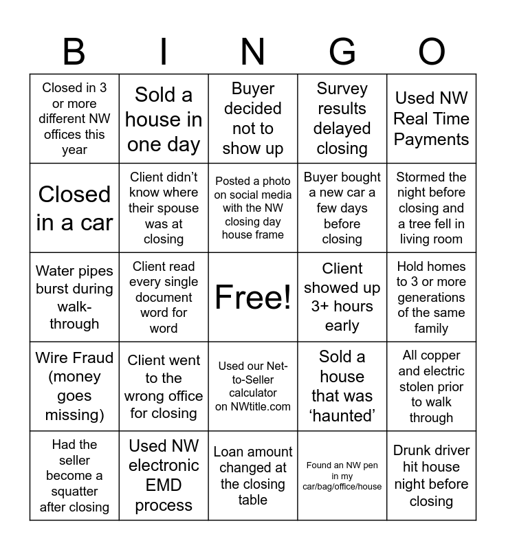 This bingo card has a free space and 26 words: Used our Net-to-Seller calculator on NWtitle.com, Found an NW pen in my car/bag/office/house, Posted a photo on social media with the NW closing day house frame, Used NW electronic EMD process, Used NW Real Time Payments, Closed in 3 or more different NW offices this year, Closed in a car, Sold a house in one day, Hold homes to 3 or more generations of the same family, Sold a house that was ‘haunted’, Buyer bought a new car a few days before closing, Water pipes burst during walk-through, All copper and electric stolen prior to walk through, Had the seller become a squatter after closing, Client read every single document word for word, Seller passed away while under contract, Survey results delayed closing, Wire Fraud (money goes missing), Buyer decided not to show up, Drunk driver hit house night before closing, Stormed the night before closing and a tree fell in living room, Loan amount changed at the closing table, Client showed up 3+ hours early, Client went to the wrong office for closing, Client didn’t know where their spouse was at closing and Habitability defects in property not disclosed or discovered until inspection.