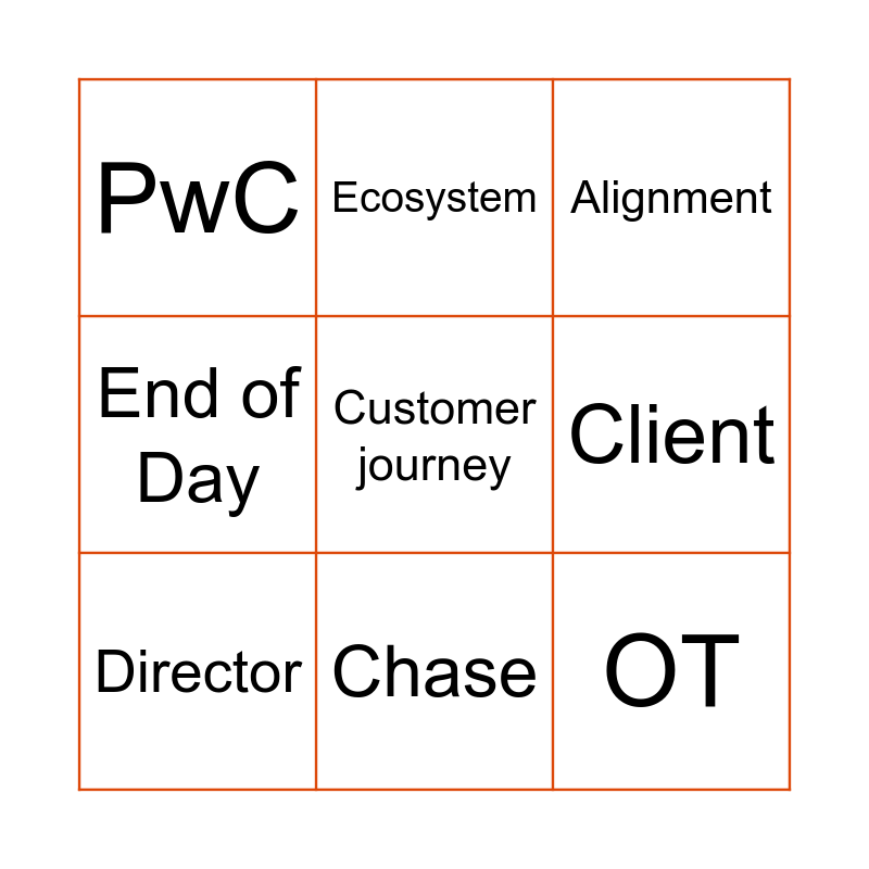 This bingo card has 75 words: Free!, Act with integrity, Alignment, Associate, Bank, Benchmarking, Boil the ocean, Bucket, C&O, COVID, Cabaret, Care, Chase, Client, Competency, Consulting, Continuous improvement, Critical path, Customer, Customer journey, Data Driven, Deliverable, Director, Ecosystem, End of Day, Engagement lead, FS, Feedback, Happy flow, Hard Stop, Insurance, Leverage, Low-hanging fruit, Make a difference, Manager, OT, Obviously, Opportunity, Out of scope, Partner, Pension, Pipeline, Pitch, Presentation, Programme, Project, Push back, PwC, Quick Win, Reach out, RegOps, Regulation, Reimagine the possible, Roadmap, Rock Star, Ski-trip, Slide deck, Strategy, Takeaway, Team, Team weekend, Thought leadership, Transformation, Win-Win, Work around, Work together, AI, Copilot, Replicon, Concur, Salesforce, Value-added, Change management, Holistic approach and Risk mitigation.