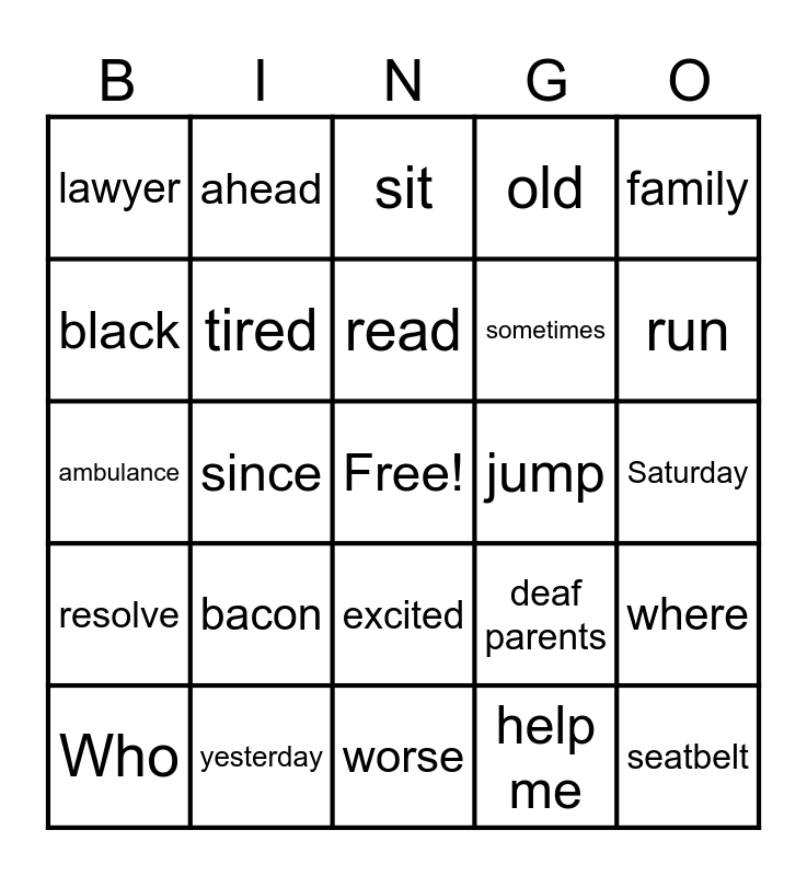This bingo card has a free space and 29 words: Who, hospital, since, information, lawyer, sit, tired, bacon, jump, yesterday, Saturday, seatbelt, worse, help me, run, spaghetti, excited, resolve, family, ambulance, deaf parents, counselor, sometimes, black, old, ahead, where, read and student.