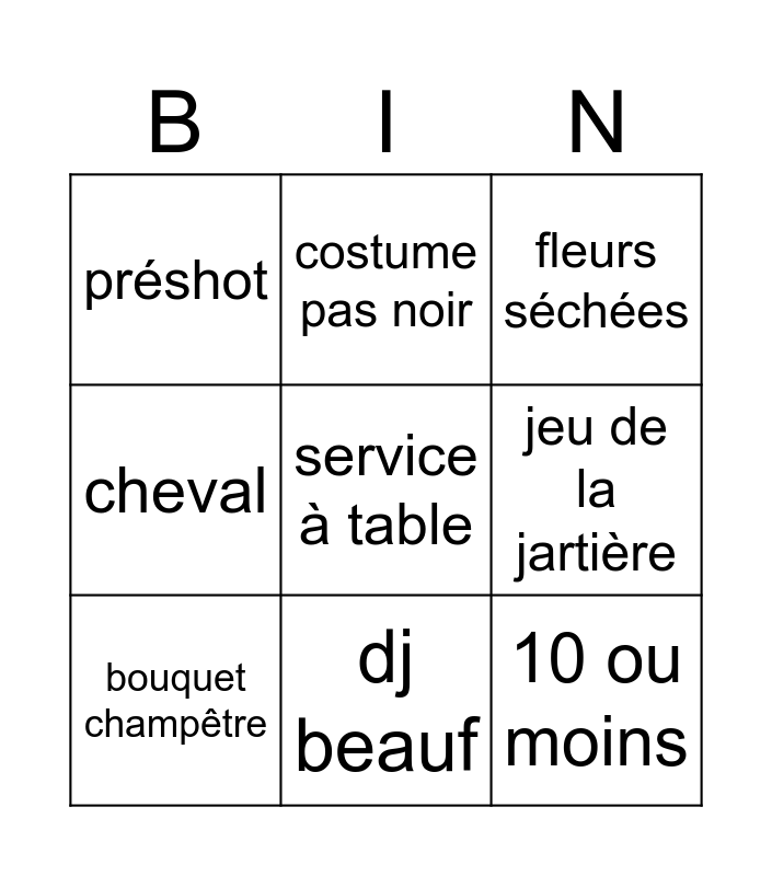 This bingo card has a free space and 8 words: jeu de la jartière, fleurs séchées, costume pas noir, bouquet champêtre, préshot, 10 ou moins, cheval and dj beauf.