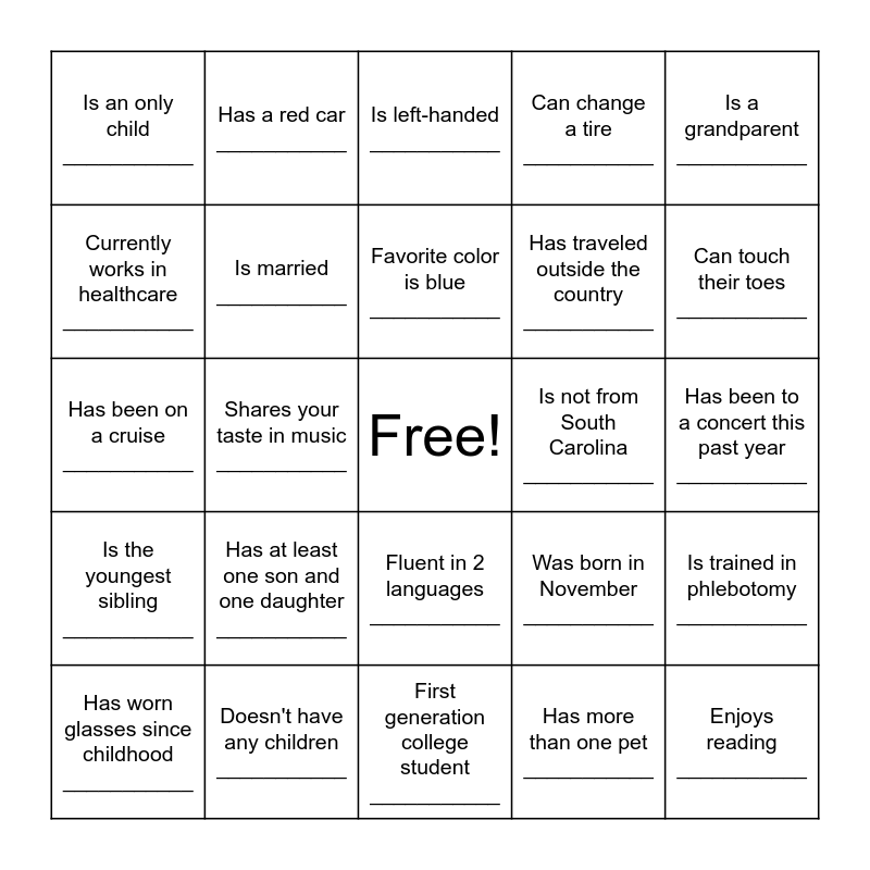 This bingo card has a free space and 24 words: Has at least one son and one daughter ___________, Doesn't have any children ___________, Favorite color is blue ___________, Has worn glasses since childhood ___________, Is a grandparent ___________, Is an only child ___________, Currently works in healthcare ___________, Has a red car ___________, Is not from South Carolina ___________, Fluent in 2 languages ___________, Has traveled outside the country ___________, Has been on a cruise ___________, Was born in November ___________, Is trained in phlebotomy ___________, Is married ___________, Has more than one pet ___________, Has been to a concert this past year ___________, Is left-handed ___________, Can touch their toes ___________, Shares your taste in music ___________, Enjoys reading ___________, Is the youngest sibling ___________, Can change a tire ___________ and First generation college student ___________.