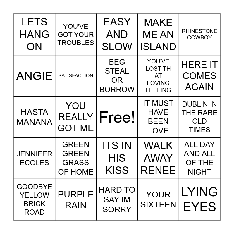 This bingo card has a free space and 43 words: CRYING IN THE RAIN, LYING EYES, WALK RIGHT BACK, GOODBYE YELLOW BRICK ROAD, REBEL REBEL, YOUR SIXTEEN, EASY AND SLOW, RASPUTIN, RHINESTONE COWBOY, PURPLE RAIN, MAKE ME AN ISLAND, IT MUST HAVE BEEN LOVE, ITS IN HIS KISS, GREEN GREEN GRASS OF HOME, MAMA MIA, HARD TO SAY IM SORRY, GREASE, HASTA MANANA, WHEN WILL I BE LOVED, HERE IT COMES AGAIN, YOU'VE GOT YOUR TROUBLES, COTTON EYED JOE, BABY NOW THAT IVE FOUND YOU, LETS HANG ON, I CANT HELP MYSELF, DUBLIN IN THE RARE OLD TIMES, ITS THE SAME OLD SONG, REACH OUT AND ILL BE THERE, WALK AWAY RENEE, JENNIFER ECCLES, STAY, ALL DAY AND ALL OF THE NIGHT, WATERLOO SUNSET, YOU REALLY GOT ME, HEY HEY WE'RE THE MONKEES, BLACKBERRY WAY, PLEASANT VALLEY SUNDAY, BEG STEAL OR BORROW, ANGIE, YOU'VE LOST THAT LOVING FEELING, JUMPING JACK FLASH, SATISFACTION and help.