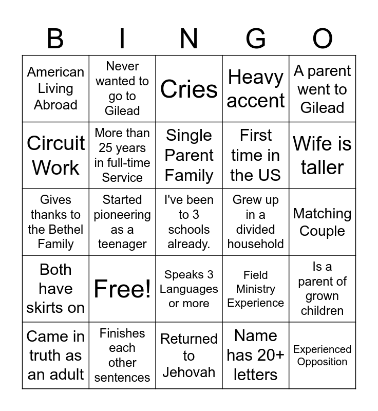 This bingo card has 25 words: Free!, Returned to Jehovah, Single Parent Family, Came in truth as an adult, A parent went to Gilead, American Living Abroad, Circuit Work, Never wanted to go to Gilead, Grew up in a divided household, Speaks 3 Languages or more, First time in the US, Gives thanks to the Bethel Family, Field Ministry Experience, Is a parent of grown children, More than 25 years in full-time Service, Experienced Opposition, Matching Couple, Cries, Wife is taller, Started pioneering as a teenager, I've been to 3 schools already., Finishes each other sentences, Both have skirts on, Heavy accent and Name has 20+ letters.