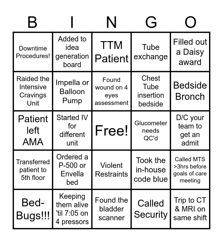 This bingo card has a free space and 42 words: Fire Drill, Found wound on 4 eyes assessment, 0630 or 1830 admission, Ordered a P-500 or Envella bed, Called Security, Called MTS >3hrs before goals of care meeting, Trip to CT & MRI on same shift, CRRT cartridge clotted, TTM Patient, Violent Restraints, D/C your team to get an admit, Bedside Bronch, Started IV for different unit, Filled out a Daisy award, Precepted a nursing student, Took the in-house code blue, Admitted a fresh trauma, Patient left AMA, Responded to CAT/Code Blue, Added to idea generation board, Raided the Intensive Cravings Unit, Continuous EEG... Yay!, Bodily fluids on scrubs, Downtime Procedures!, Flew Patient Out, Restocked nurse servers for the unit, Chest Tube insertion bedside, Patient's daughter is a "Nurse", Lactic >10, Mass Transfusion, Called an Inpatient Code Stroke, Transferred patient to 5th floor, Impella or Balloon Pump, Found the bladder scanner, Covid positive on day 2 or more, Bed-Bugs!!!, Keeping them alive 'til 7:05 on 4 pressors, Glucometer needs QC'd, PH <7, Mystery transfer from OSH, Tube exchange and Brain Drain.