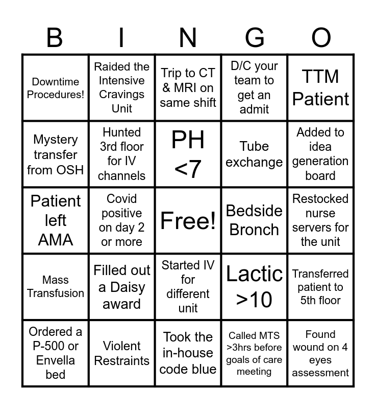 This bingo card has a free space and 44 words: Fire Drill, Found wound on 4 eyes assessment, 0630 or 1830 admission, Ordered a P-500 or Envella bed, Called Security, Called MTS >3hrs before goals of care meeting, Trip to CT & MRI on same shift, CRRT cartridge clotted, TTM Patient, Violent Restraints, D/C your team to get an admit, Bedside Bronch, Started IV for different unit, Filled out a Daisy award, Precepted a nursing student, Took the in-house code blue, Admitted a fresh trauma, Patient left AMA, Responded to CAT/Code Blue, Added to idea generation board, Raided the Intensive Cravings Unit, Continuous EEG... Yay!, Bodily fluids on scrubs, Downtime Procedures!, Flew Patient Out, Restocked nurse servers for the unit, Chest Tube insertion bedside, Patient's daughter is a "Nurse", Lactic >10, Mass Transfusion, Called an Inpatient Code Stroke, Transferred patient to 5th floor, Impella or Balloon Pump, Found the bladder scanner, Covid positive on day 2 or more, Bed-Bugs!!!, Keeping them alive 'til 7:05 on 4 pressors, Glucometer needs QC'd, PH <7, Mystery transfer from OSH, Tube exchange, Brain Drain, Hunted 3rd floor for IV channels and CO2 >105.