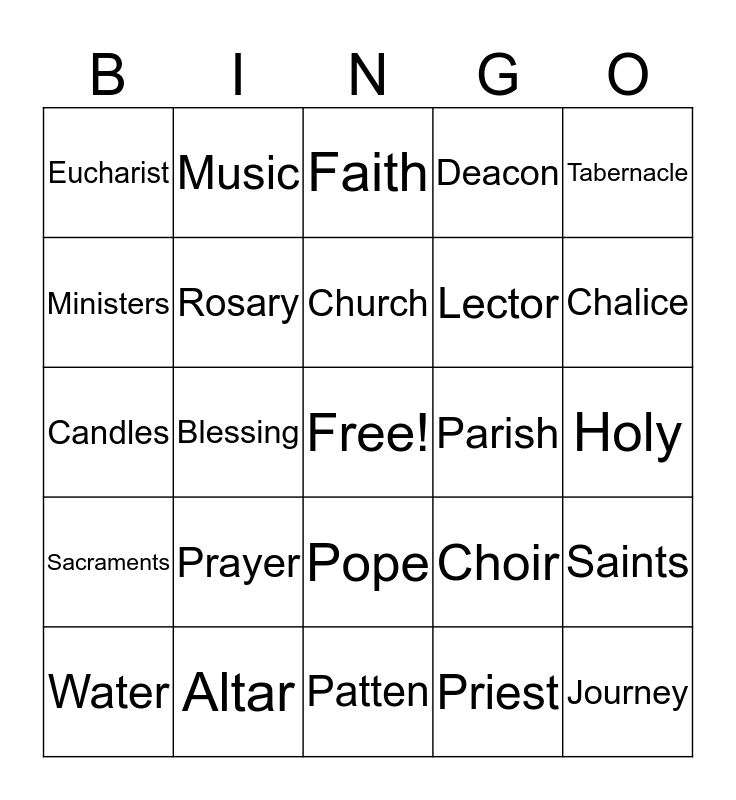 This bingo card has a free space and 26 words: Pope, Priest, Church, Altar, Tabernacle, Eucharist, Ministers, Music, Holy, Choir, Lector, Candles, Saints, Water, Blessing, Bishop, Deacon, Sacraments, Faith, Journey, Chalice, Patten, Parish, Prayer, Rosary and Mass.