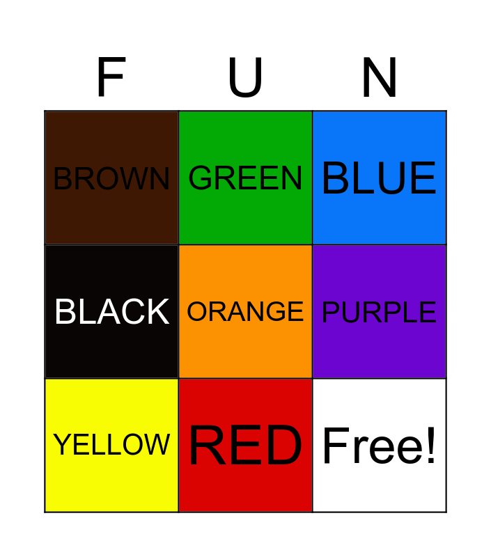 This bingo card has 11 words: Free!, RED, ORANGE, YELLOW, GREEN, BLUE, PURPLE, PINK, BLACK, BROWN and WHITE.