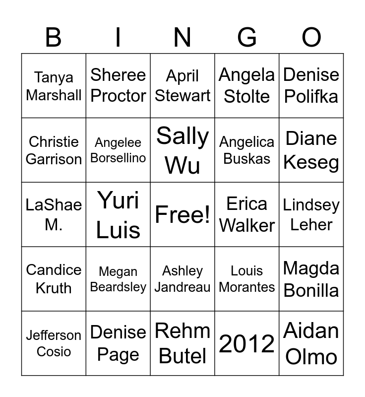 This bingo card has a free space and 31 words: Rehm Butel, Brooke Kowalski, Yuri Luis, Jeoffrey Aurelio, Tanya Marshall, April Stewart, Angelee Borsellino, Louis Morantes, Erica Walker, 2012, Lindsey Leher, Aidan Olmo, Karina Cordova, Dr. Parker, Diane Keseg, Adrian Gudino, Magda Bonilla, Megan Beardsley, Candice Kruth, Ashley Jandreau, Denise Polifka, Arianna Alvarado, Jefferson Cosio, Sheree Proctor, Angelica Buskas, Christie Garrison, Angela Stolte, LaShae M., Denise Page, Sally Wu and Kate Li-Tratos.