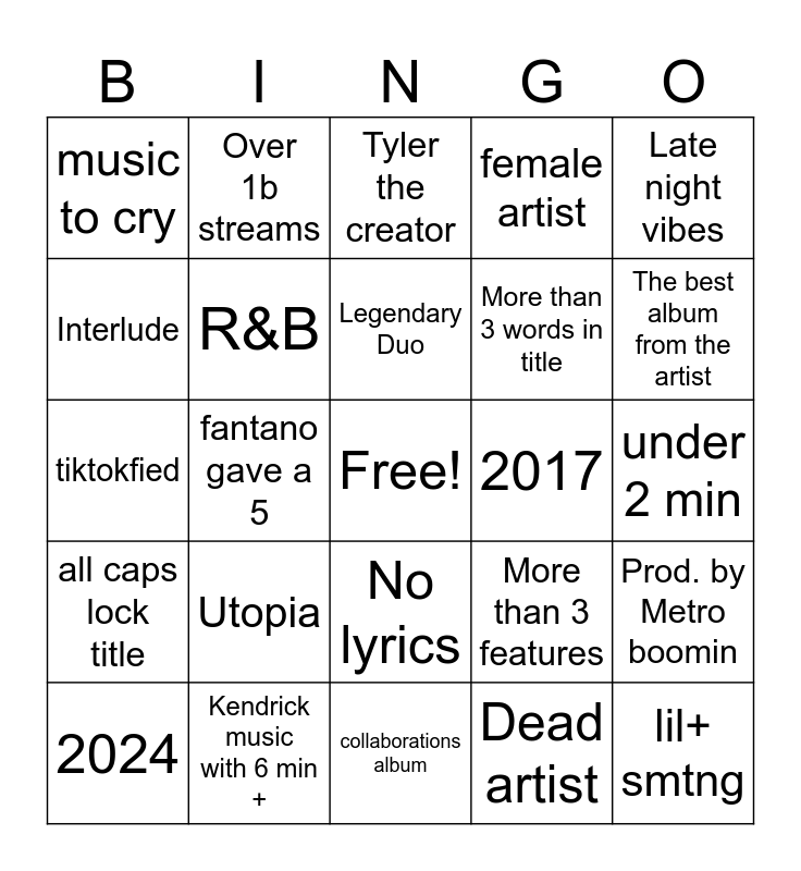 This bingo card has a free space and 24 words: Utopia, Kendrick music with 6 min +, Legendary Duo, 2024, Late night vibes, music to cry, Interlude, Over 1b streams, 2017, No lyrics, More than 3 words in title, tiktokfied, More than 3 features, Prod. by Metro boomin, R&B, Dead artist, under 2 min, Tyler the creator, The best album from the artist, fantano gave a 5, lil+ smtng, all caps lock title, female artist and collaborations album.