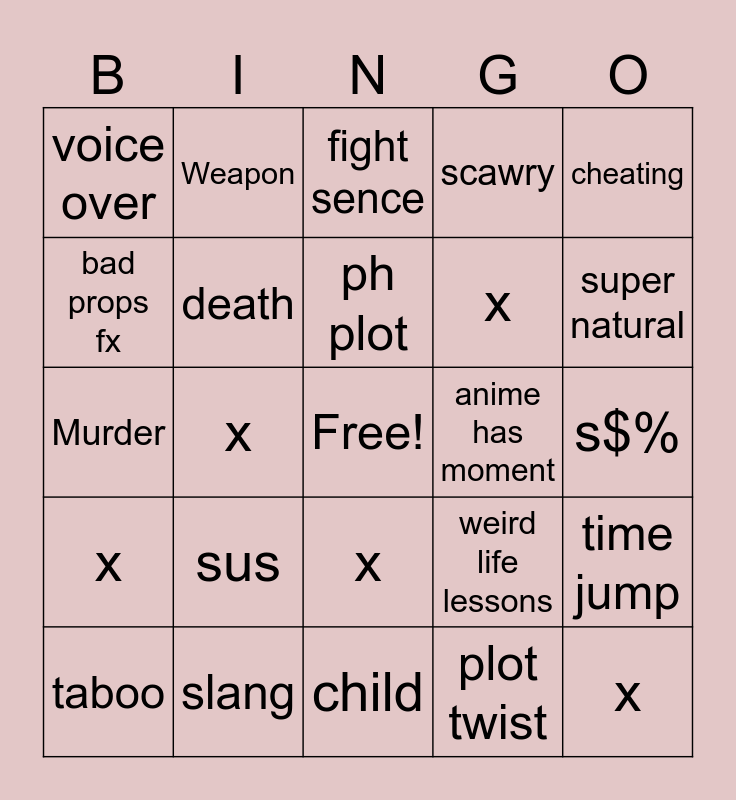 This bingo card has a free space and 24 words: taboo, sus, ph plot, plot twist, cheating, voice over, Weapon, fight sence, anime has moment, s$%, Murder, death, weird life lessons, time jump, bad props fx, slang, child, scawry, super natural, x, x, x, x and x.