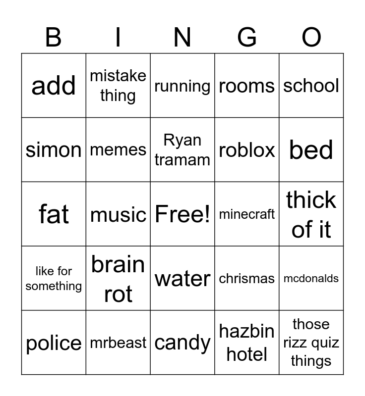 This bingo card has a free space and 24 words: brain rot, mrbeast, Ryan tramam, police, school, add, simon, mistake thing, minecraft, water, roblox, fat, chrismas, mcdonalds, memes, hazbin hotel, thick of it, running, bed, music, those rizz quiz things, like for something, rooms and candy.