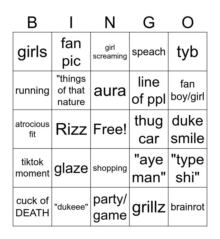This bingo card has a free space and 24 words: glaze, "dukeee", aura, cuck of DEATH, tyb, girls, running, fan pic, thug car, shopping, line of ppl, atrocious fit, "aye man", "type shi", "things of that nature, grillz, duke smile, girl screaming, fan boy/girl, Rizz, brainrot, tiktok moment, speach and party/ game.