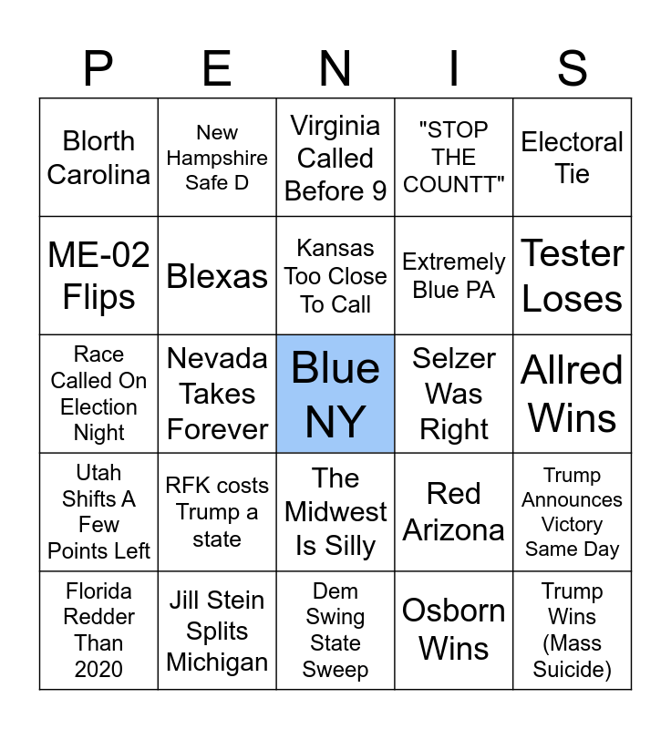This bingo card has a free space and 24 words: Florida Redder Than 2020, RFK costs Trump a state, Kansas Too Close To Call, Osborn Wins, Electoral Tie, Blorth Carolina, New Hampshire Safe D, Virginia Called Before 9, Selzer Was Right, Allred Wins, Race Called On Election Night, Blexas, Red Arizona, Trump Announces Victory Same Day, ME-02 Flips, Jill Stein Splits Michigan, Dem Swing State Sweep, "STOP THE COUNTT", Tester Loses, Utah Shifts A Few Points Left, Nevada Takes Forever, The Midwest Is Silly, Extremely Blue PA and Trump Wins (Mass Suicide).