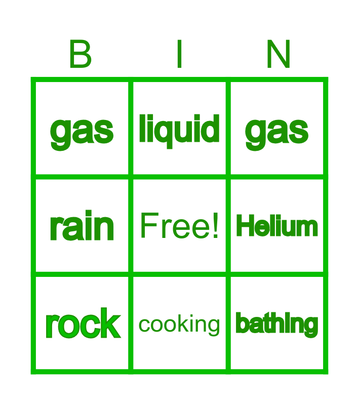 This bingo card has a free space and 9 words: rock, gas, liquid, rain, gas, Helium, bathing, dishwashers and cooking.