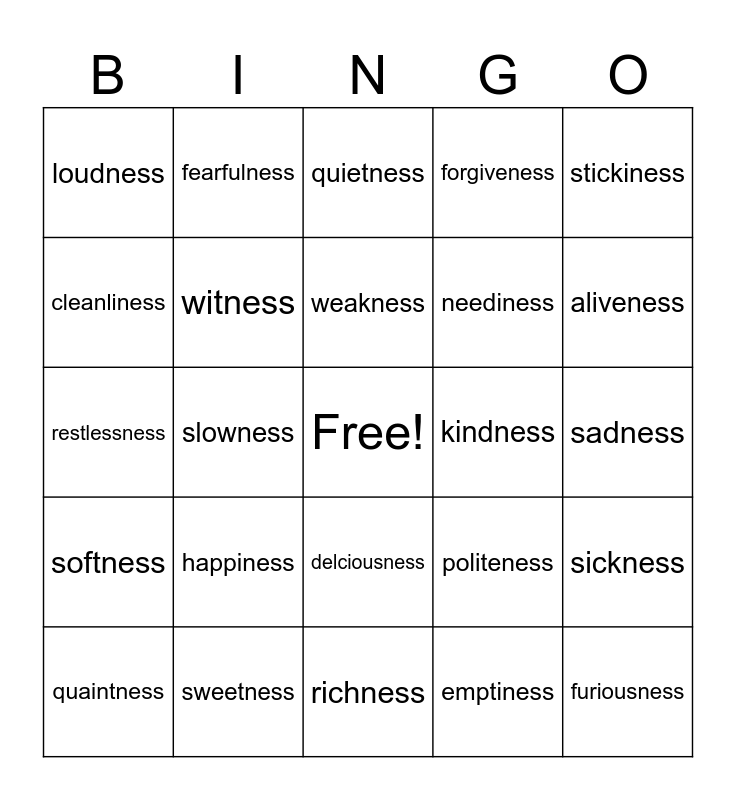 This bingo card has a free space and 29 words: quaintness, sleepiness, slowness, fitness, loudness, quietness, witness, happiness, kindness, sweetness, sadness, furiousness, richness, emptiness, aliveness, attentiveness, delciousness, softness, stickiness, restlessness, politeness, greatness, neediness, cleanliness, forgiveness, fearfulness, sickness, weakness and illness.