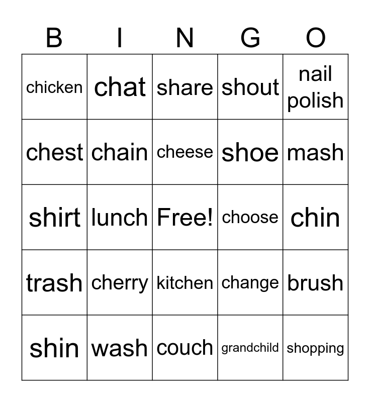 This bingo card has a free space and 29 words: chair, wash, share, dishes, nail polish, chicken, chain, cheese, choose, brush, shin, lunch, grandchild, shopping, shirt, fish, couch, change, mash, trash, cherry, cash, shoe, chin, chest, chat, kitchen, shout and machine.