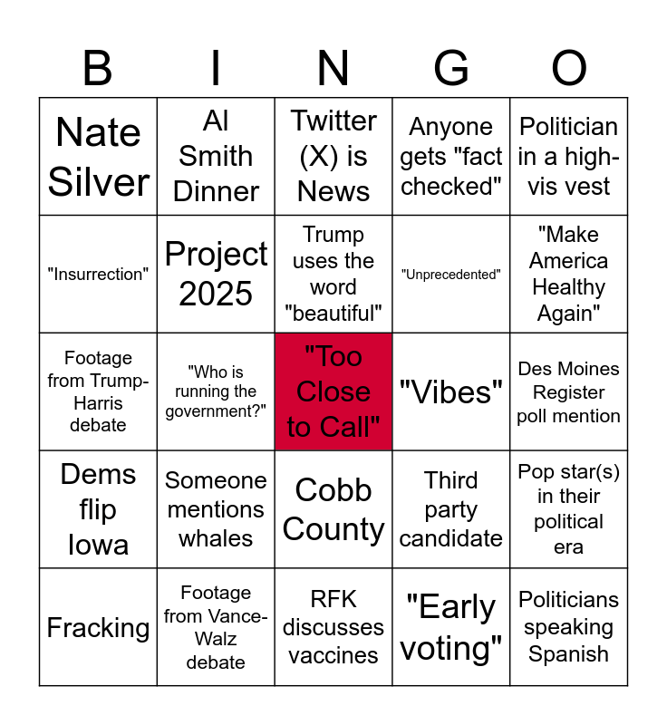 This bingo card has a free space and 91 words: Footage of the Southern Border, Talking head in a MAGA hat, Cobb County, Walz, "Stop the steal", Compliments to the Decision Desk team, Talking head in a camo Harris-Walz cap, Luzerne County, Vance, SNL vs. the FCC, New Fox News features, Harris uses the word "unburdened", "Tough on crime", Des Moines Register poll mention, "Make America Great Again", Trump uses the word "beautiful", Rally size controversy, Technical difficulties, A fly gets stuck in someone's hair, "A New Way Forward", Border Wall, Biden, RFK discusses vaccines, Footage from Trump-Biden debate, Footage from Trump-Harris debate, Footage from Vance-Walz debate, Vivek, Mark Cuban, Liz Cheney, Tulsi Gabbard, Elon Musk, Pop star(s) in their political era, GOP flips NH, Dems flip Iowa, Nate Silver, Anyone gets "fact checked", Twitter (X) is News, Dr. Jill Biden, "Who is running the government?", "Make America Healthy Again", Fracking, "Insurrection", 25th Amendment, "Impeachment", "On Day 1...", Third party candidate, "Joy", SNL clip, Presidential Pardons, "Free speech", Greater Idaho, "Unprecedented", "The American people", Jonathan Turley, Supreme Court, Politician interacts with a baby, "Vibes", "Earned media", "Dark MAGA", White House shown on screen, Capitol building shown on screen, American flag waving in the breeze, Interview with a "middle class voter", Billionares owning newspapers, Teleprompter malfunctions, "Margin of error", "Historic levels", "Early voting", "Fiery but mostly peaceful", TikTok personality opines on the American political order, Someone mentions whales, Politicians speaking Spanish, "Comedian(s)" not being funny, Space Force, Al Smith Dinner, Project 2025, "Divided Government", "Popular Vote", "Blue Wall", McDonalds, Garbage Truck, Politician in a high-vis vest, Middle Class Family, "Real estate mogul", Talking head speaks of his experience grocery shopping, Barack Obama, Michelle Obama, Breaking News, Jim Jordan, "subpoena power" and "lawfare".