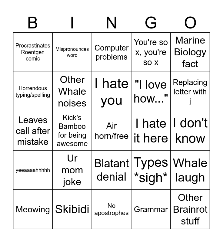 This bingo card has a free space and 24 words: Ur mom joke, Skibidi, I hate you, Meowing, Marine Biology fact, Procrastinates Roentgen comic, Horrendous typing/spelling, Mispronounces word, I hate it here, Blatant denial, "I love how...", Leaves call after mistake, Types *sigh*, Whale laugh, Other Whale noises, Grammar, I don't know, Computer problems, Replacing letter with j, Kick's Bamboo for being awesome, Other Brainrot stuff, yeeaaaahhhhh, You're so x, you're so x and No apostrophes.