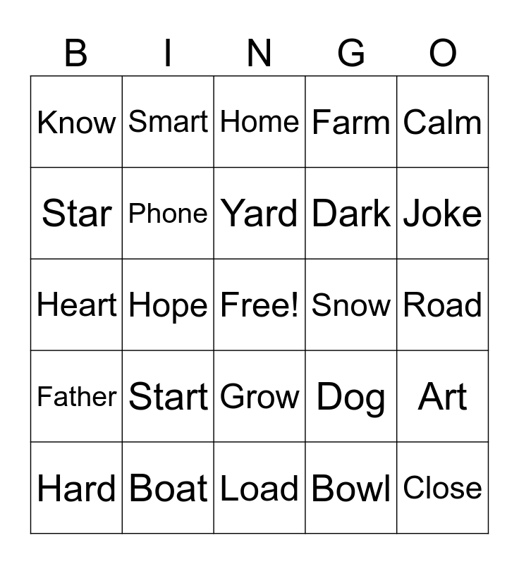 This bingo card has a free space and 30 words: Boat, Go, Hope, Show, Know, Home, Phone, Grow, Snow, Load, Road, Close, Bowl, Soap, Joke, Car, Dog, Father, Start, Calm, Heart, Part, Smart, Dark, Star, Farm, Art, Hard, Yard and Palm.