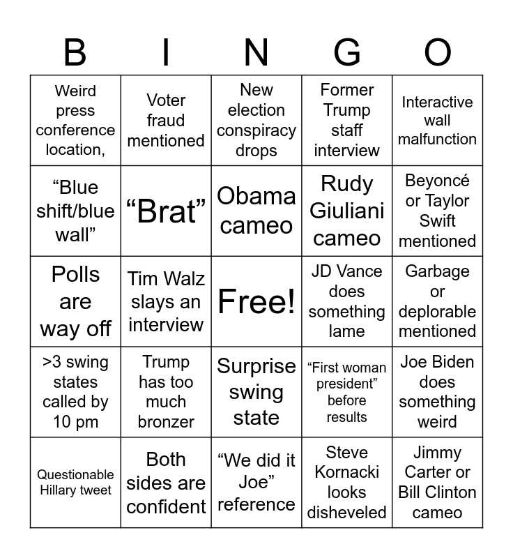 This bingo card has a free space and 24 words: Trump has too much bronzer, Both sides are confident, Obama cameo, Questionable Hillary tweet, Interactive wall malfunction, Weird press conference location,, “Blue shift/blue wall”, Voter fraud mentioned, JD Vance does something lame, Surprise swing state, Rudy Giuliani cameo, Polls are way off, “First woman president” before results, Joe Biden does something weird, “Brat”, Steve Kornacki looks disheveled, Garbage or deplorable mentioned, New election conspiracy drops, Beyoncé or Taylor Swift mentioned, Tim Walz slays an interview, Jimmy Carter or Bill Clinton cameo, >3 swing states called by 10 pm, Former Trump staff interview and “We did it Joe” reference.