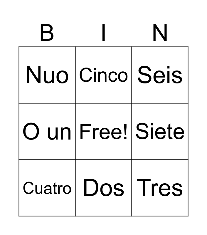 This bingo card has a free space and 11 words: Uno, Dos, Tres, Cuatro, Cinco, Seis, Siete, Ocho, O un, Nuo and Onu.