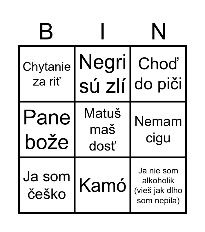 This bingo card has 9 words: Ja som češko, Matuš maš dosť, Choď do piči, Chytanie za riť, Negri sú zlí, Nemam cigu, Pane bože, Kamó and Ja nie som alkoholik (vieš jak dlho som nepila).