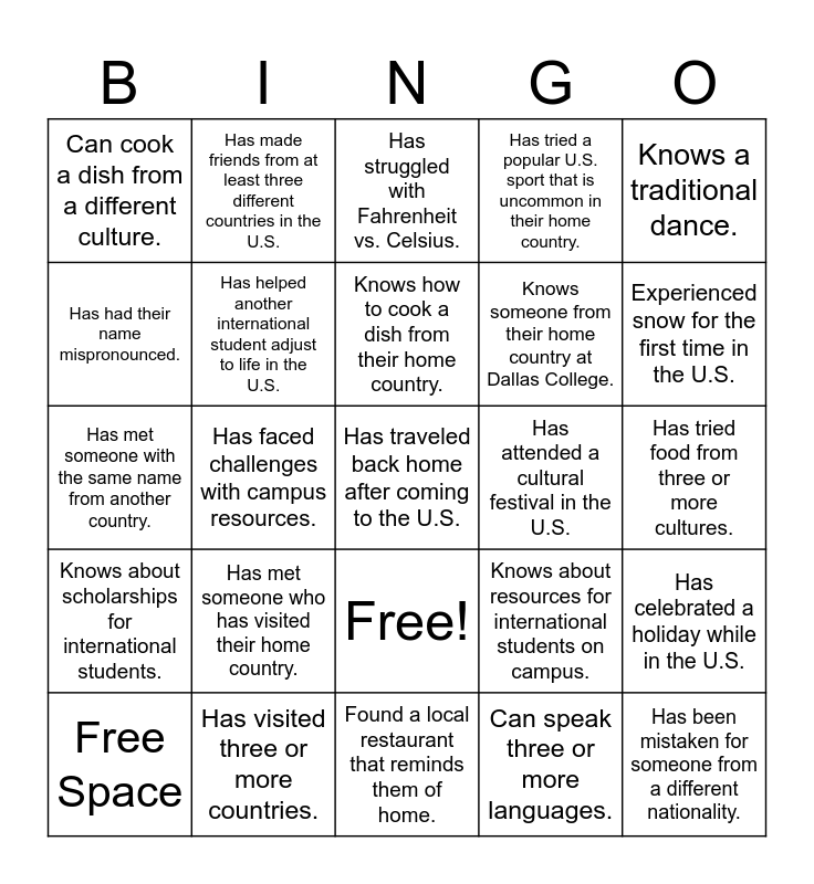 This bingo card has 26 words: Free!, Can speak three or more languages., Knows how to cook a dish from their home country., Has visited three or more countries., Knows a traditional dance., Can cook a dish from a different culture., Has had their name mispronounced., Has made friends from at least three different countries in the U.S., Has tried food from three or more cultures., Knows about resources for international students on campus., Knows someone from their home country at Dallas College., Has met someone with the same name from another country., Has celebrated a holiday while in the U.S., Free Space, Has faced challenges with campus resources., Has lived in more than one U.S. city., Has tried a popular U.S. sport that is uncommon in their home country., Knows about scholarships for international students., Has struggled with Fahrenheit vs. Celsius., Has traveled back home after coming to the U.S., Experienced snow for the first time in the U.S., Found a local restaurant that reminds them of home., Has attended a cultural festival in the U.S., Has met someone who has visited their home country., Has helped another international student adjust to life in the U.S. and Has been mistaken for someone from a different nationality..
