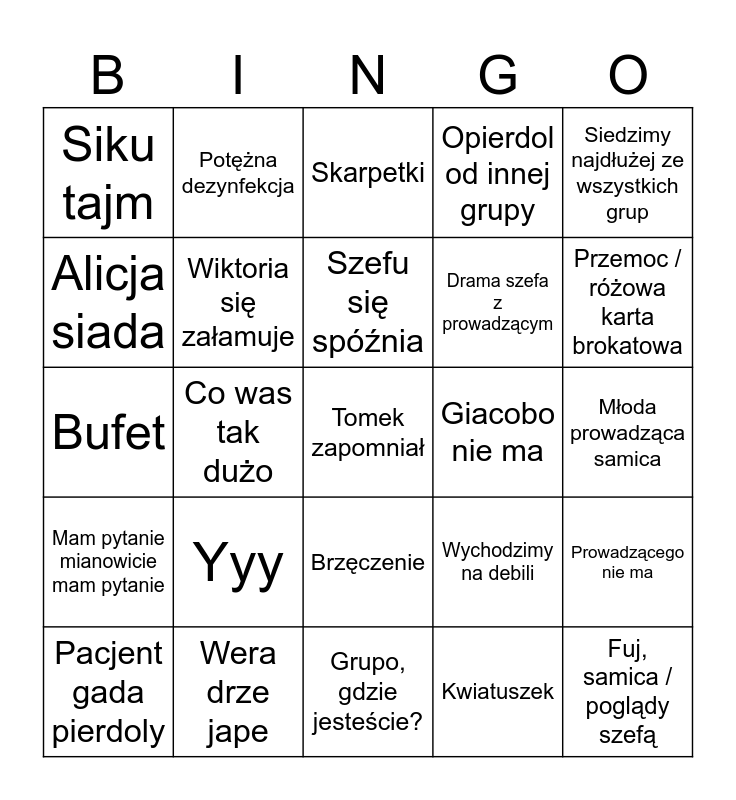 This bingo card has a free space and 24 words: Yyy, Wera drze jape, Szefu się spóźnia, Pacjent gada pierdoly, Siedzimy najdłużej ze wszystkich grup, Siku tajm, Alicja siada, Potężna dezynfekcja, Giacobo nie ma, Brzęczenie, Drama szefa z prowadzącym, Bufet, Wychodzimy na debili, Prowadzącego nie ma, Wiktoria się załamuje, Kwiatuszek, Młoda prowadząca samica, Skarpetki, Przemoc / różowa karta brokatowa, Co was tak dużo, Fuj, samica / poglądy szefą, Mam pytanie mianowicie mam pytanie, Opierdol od innej grupy and Grupo, gdzie jesteście?.
