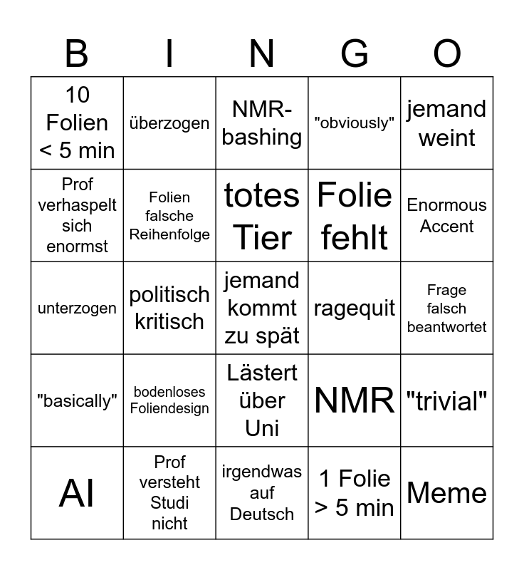 This bingo card has 50 words: Free!, jemand kommt zu spät, Kringeliger Witz, irgendwas auf Deutsch, bodenloses Foliendesign, Mausestill bei Frage, überzogen, Rechtschreib-fehler auf Folie, Prof verhaspelt sich enormst, "Hattet ihr schon im Bachelor", Folien falsche Reihenfolge, "obviously", "trivial", NMR, technische Probleme, unnötig lautes Geräusch aus Zuschauer-schaft, totes Tier, ragequit, makespec. mowment, jemand weint, politisch kritisch, 1 Folie > 5 min, 10 Folien < 5 min, Folie fehlt, Hausaufgaben, Meme, Enormous Accent, Profs Privatleben, NMR-bashing, Lästert über Uni, "Was heißt das auf Englisch?", "or in german: ...", Mobile Gamer, Studi beendet Profs sätze, Prof versteht Studi nicht, Prof traurig dass alle skippen, Nudes, Vom Prof geghosted, Arsch-Spaghetti, Frage falsch beantwortet, Zu wenig platz, Pop-Culture-Reference, "Any questions?", C. Elegans & Drosophila, AI, unterzogen, Comic Sans, Mikro geht aus, "basically" and Sportacus -Moment.
