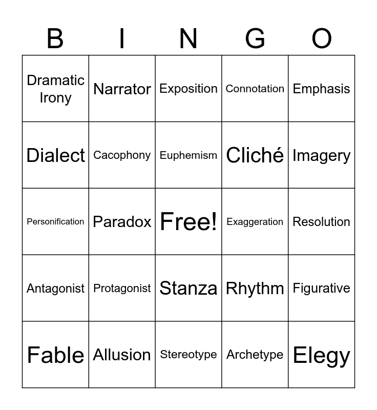 This bingo card has a free space and 60 words: Allegory, Allusion, Ambiguity, Antagonist, Archetype, Ballad, Cacophony, Caricature, Cliché, Climax, Connotation, Denotation, Dialect, Dialogue, Diction, Dramatic Irony, Elegy, Emphasis, Epitome, Euphemism, Exaggeration, Exposition, Fable, Figurative, Flashback, Foreshadowing, Hyperbole, Idiom, Imagery, Irony, Juxtaposition, Metaphor, Mood, Motif, Narrator, Onomatopoeia, Oxymoron, Paradox, Parody, Personification, Plot, Protagonist, Resolution, Rhyme, Rhythm, Satire, Setting, Simile, Soliloquy, Stanza, Stereotype, Symbolism, Theme, Tone, Tragedy, Understatement, Verse, Voice, Wit and Wordplay.